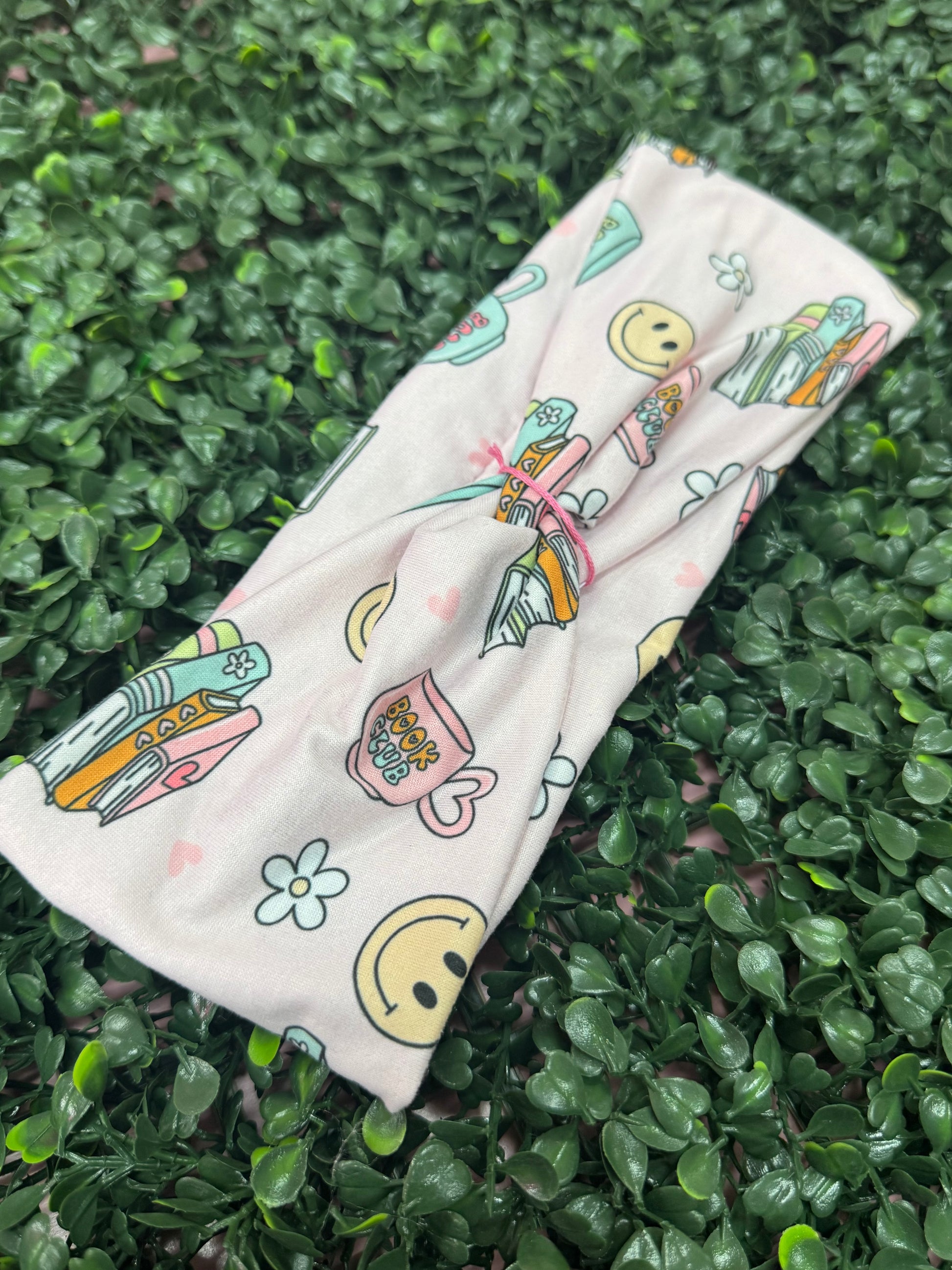 Introducing the Book Club Headband - the perfect accessory for avid readers. Made with comfy and stretchy materials, it features cute smiley faces and coffee cups, adding a touch of bookworm charm to any outfit. Show off your love for reading with this fun and functional headband.