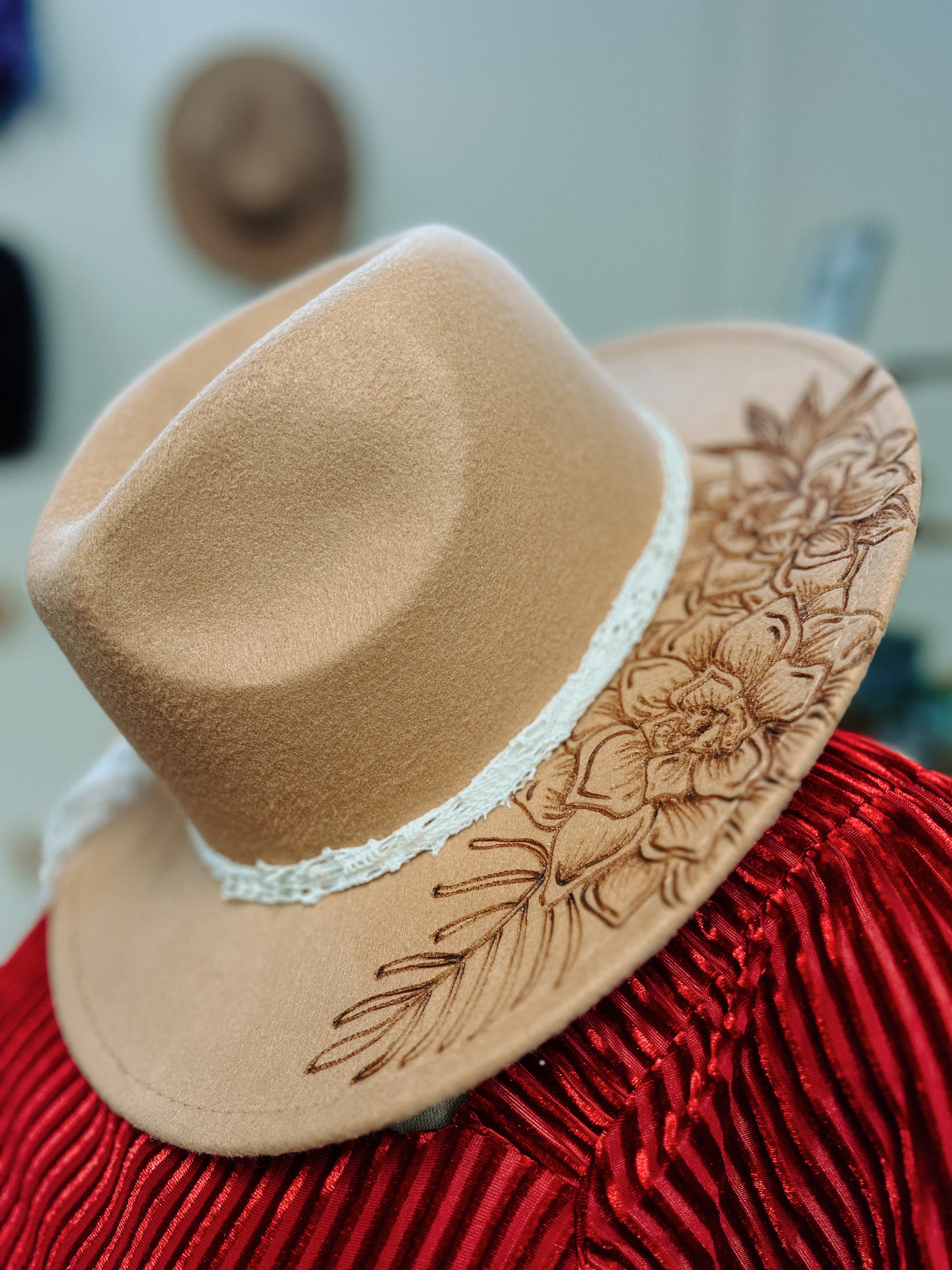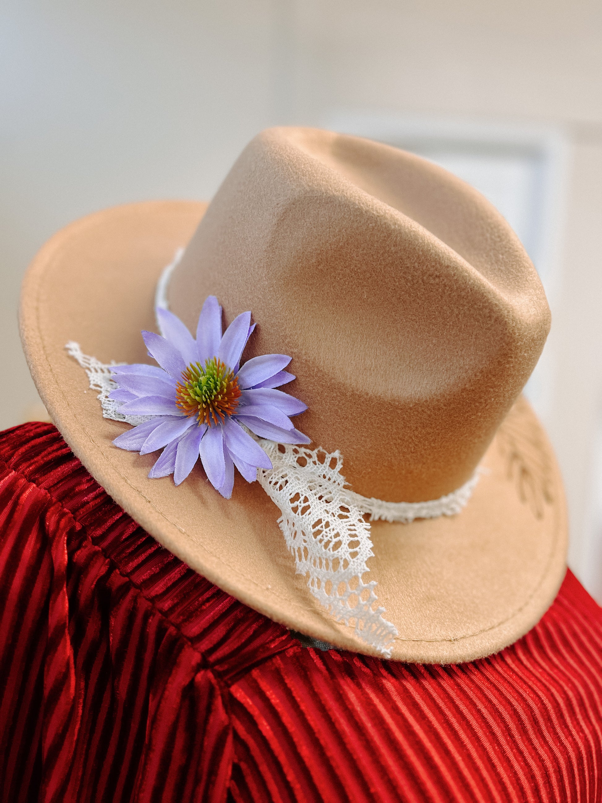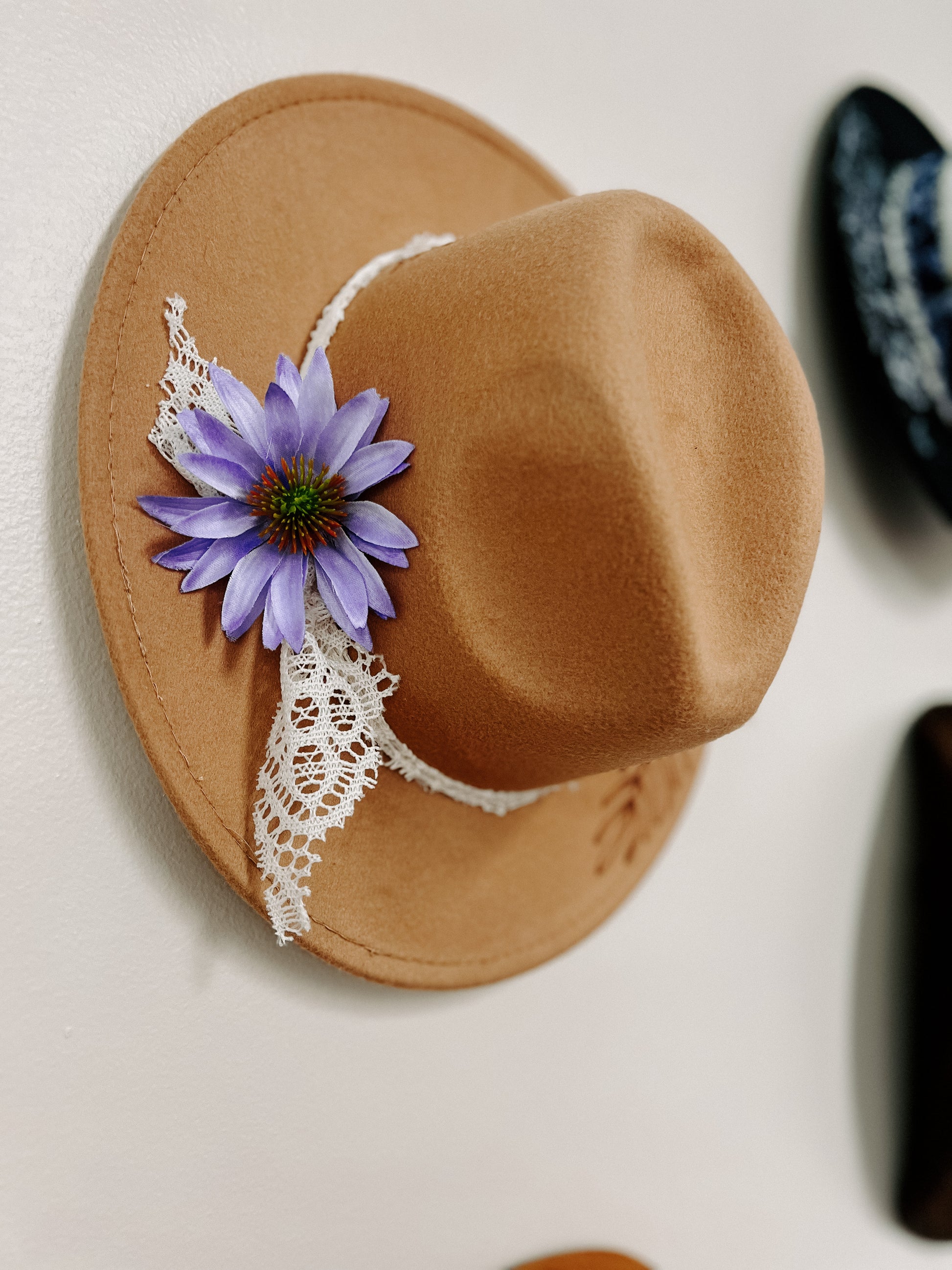 This locally made Burned Western Hat features a stunning purple flower with delicate white lace and a unique burned floral design. The perfect statement piece for any outfit, this hat showcases expert craftsmanship and adds a touch of feminine charm.