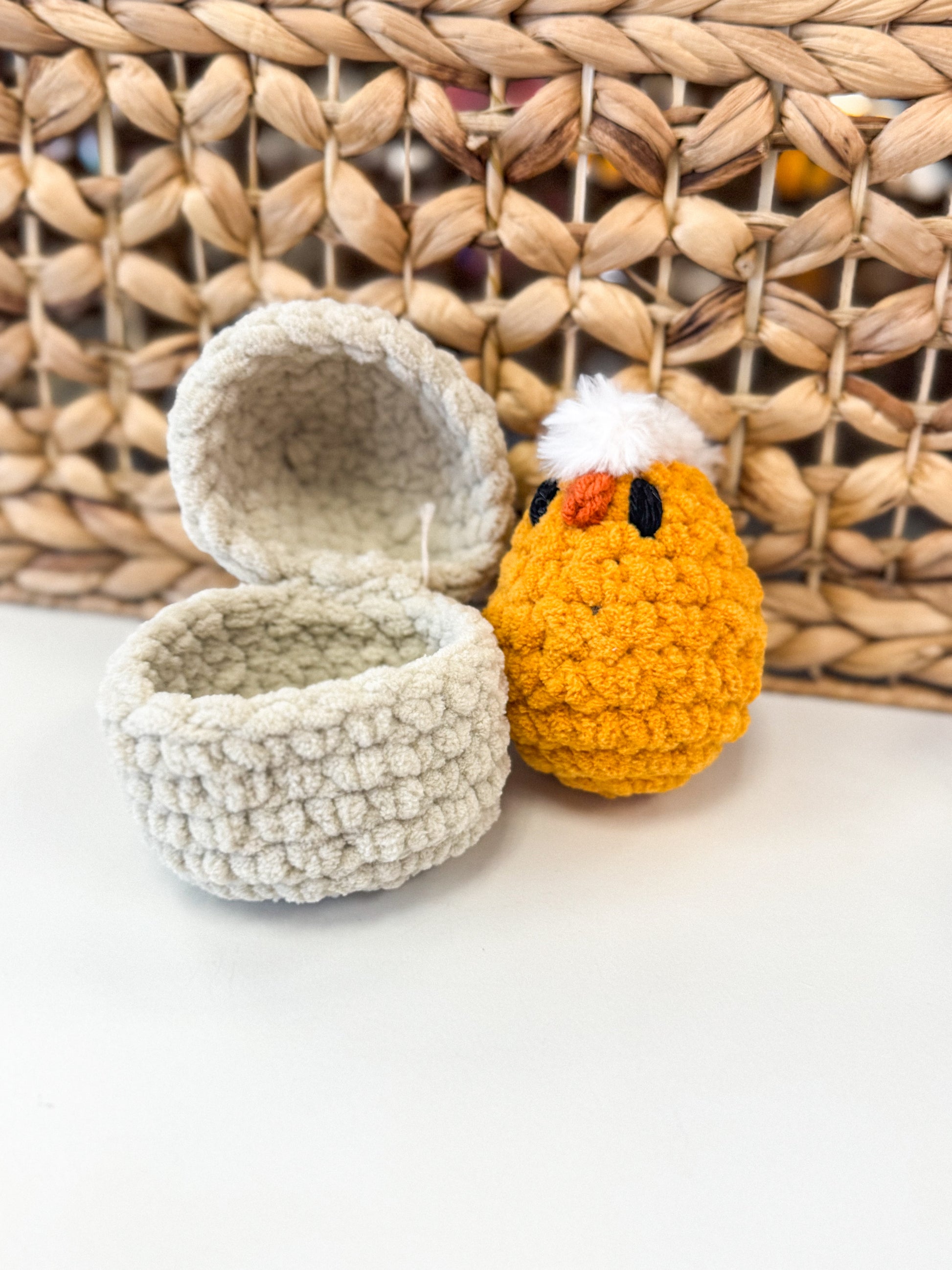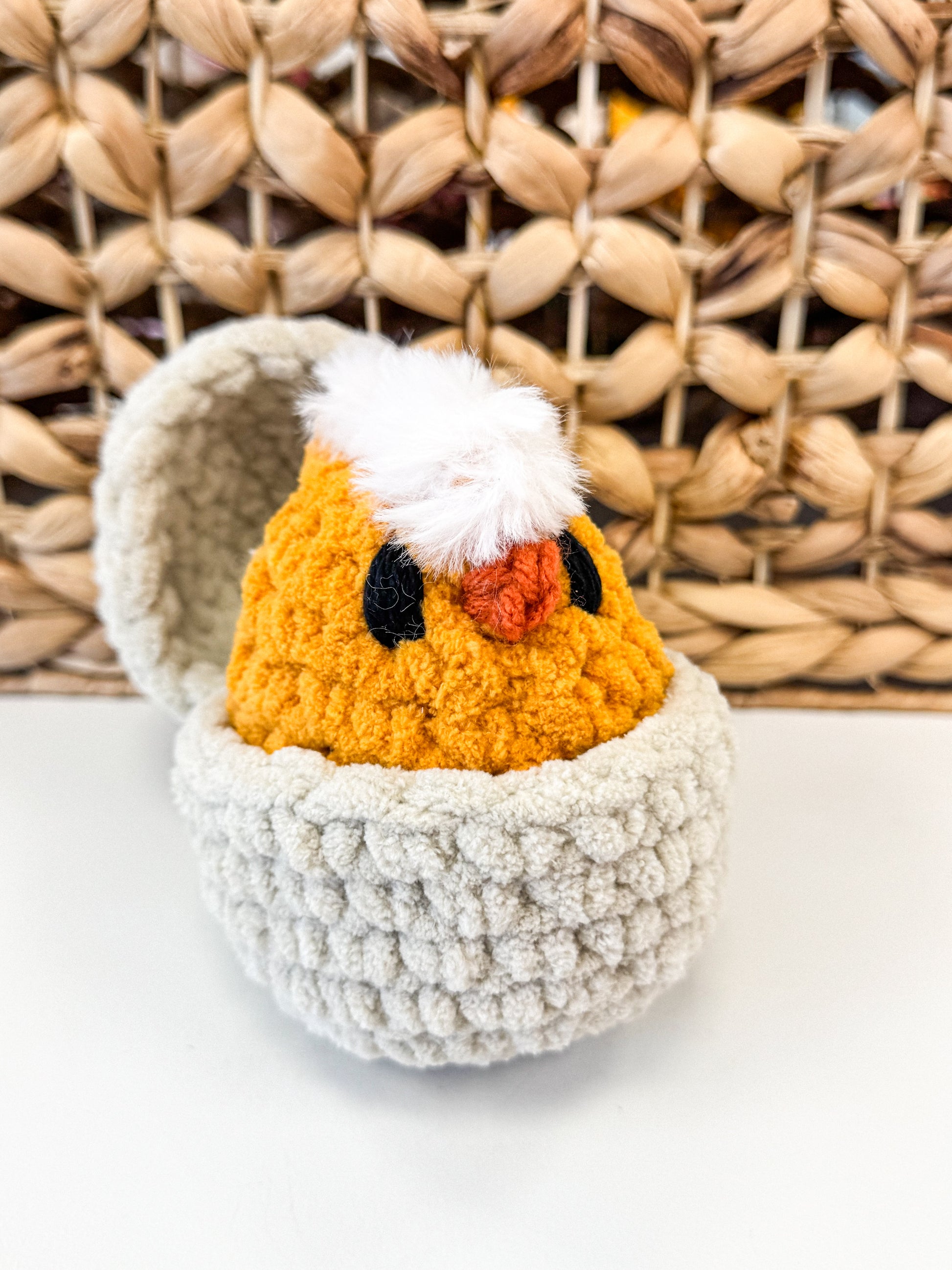 Introducing our adorable Hatching Chick Crochet Plushie! This unique, handmade plushie is perfect for children and adults alike. Its intricate crochet design gives it a charming and one-of-a-kind look, making it a lovely addition to any toy collection. Bring this cute little chick home today and make it a part of your family!