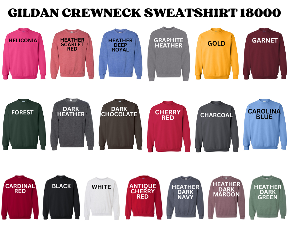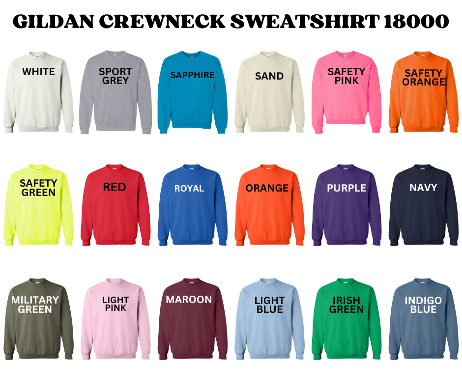 Size Small-5XL. For Gildan shirts, crewneck sweatshirts and hoodies.