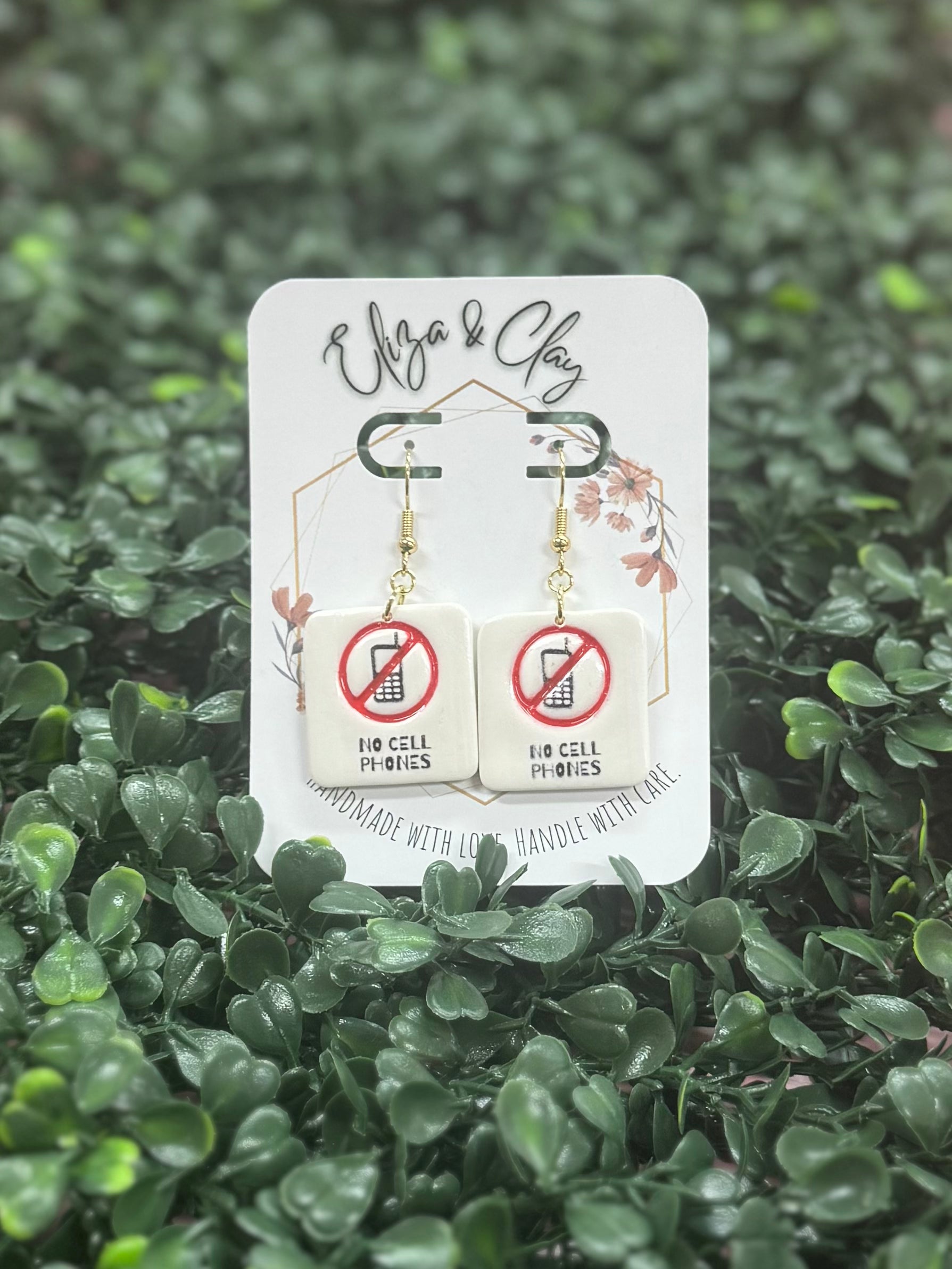 "Put your phone down and elevate your style with these quirky No Cell Phones Dangles. Handcrafted with polymer clay, these earrings add a touch of fun to any outfit. Say goodbye to boring accessories and hello to a playful and unique look. (No need for a filter with these statement pieces!)"