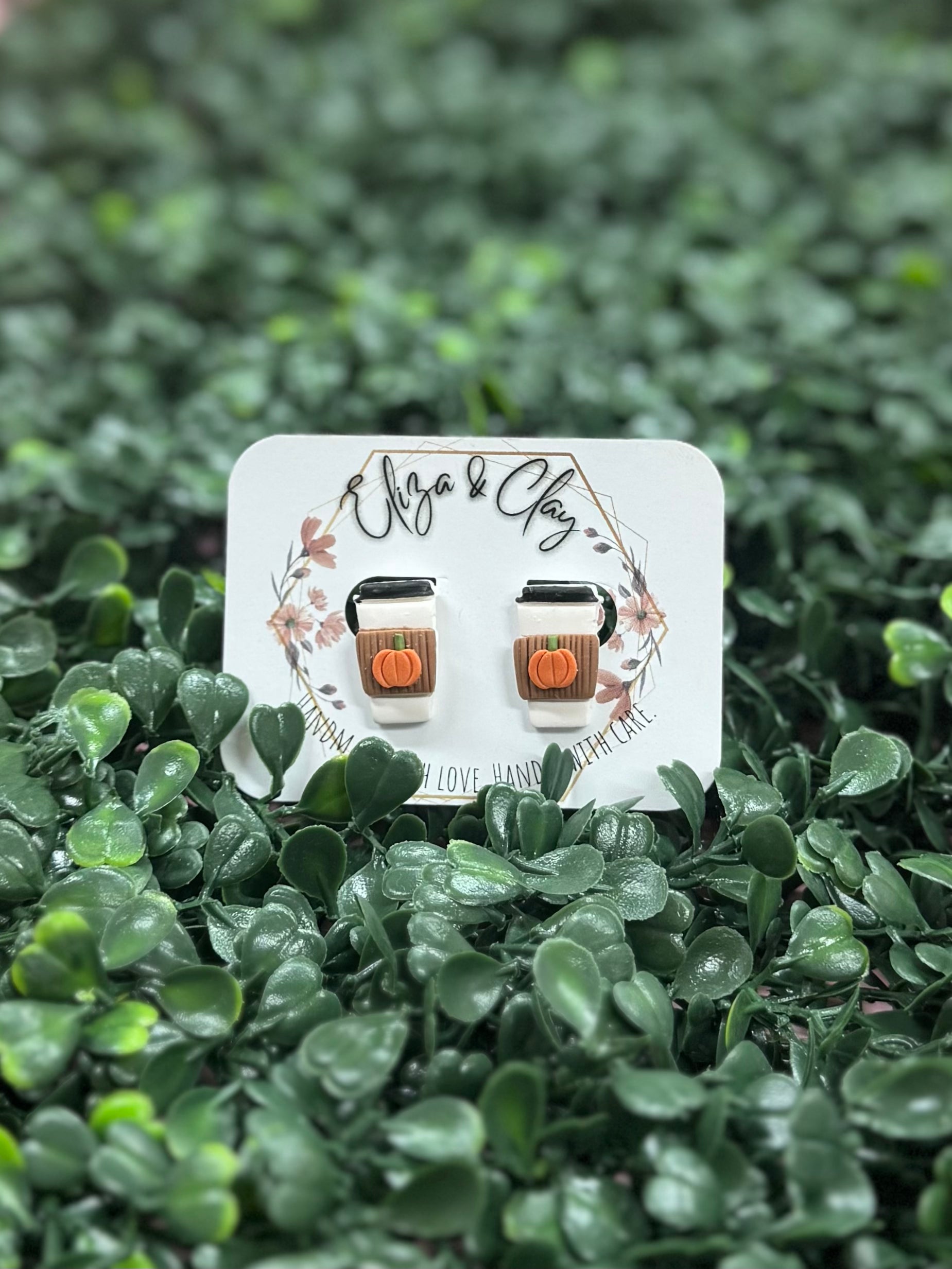 Sip on some autumn vibes with our Pumpkin Latte Studs! These handmade polymer clay earrings feature a pumpkin latte design that adds a fun twist to any outfit. Perfect for your favorite coffee lover. Don't miss out on this one-of-a-kind accessory!