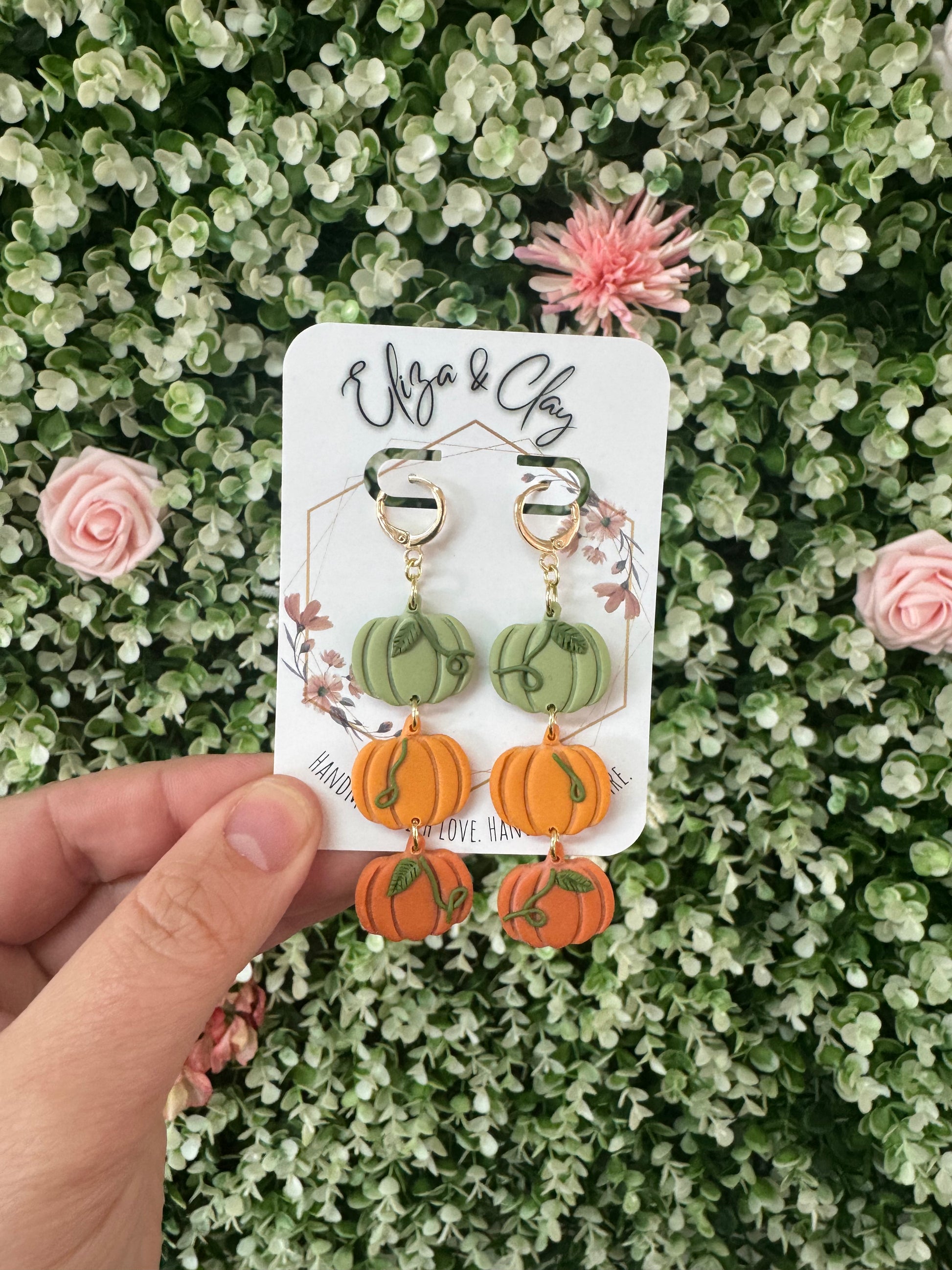 "Add some playful charm to your outfit with these Three Tier Pumpkins! Handcrafted with polymer clay, these earrings are sure to be a unique and quirky addition to your jewelry collection. Perfect for pumpkin spice season (or any time of year, really)!"